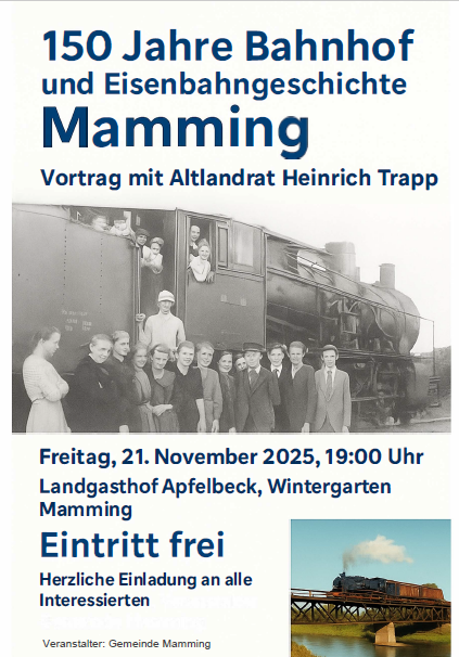 05. November 2025 Teilen Sie diesen Post Share on FacebookShare on Facebook Share on WhatsAppShare on WhatsApp KommentarnavigationZurückVorheriger Beitrag:Sperrung Bahnübergang Gottfrieding / Mamming Brückenstraße, Mühlenweg, RosenauNächstesNächster Beitrag:Lange Bürgersprechstunde der Bürgermeisterin am 20. November 2025Weitere Beiträge zu diesem ThemaDas Gewässerrandstreifenprojekt kommt nach Dingolfing-Landau05. November 2025Lange Bürgersprechstunde der Bürgermeisterin am 20. November 202505. November 2025Sperrung Bahnübergang Gottfrieding / Mamming Brückenstraße, Mühlenweg, Rosenau29. August 2025Wahlplakate in der Gemeinde – Informationen zur Plakatierung in Wahlzeiten06. Juni 2025Mähroboter bitte nur am Tag – Rücksicht auf Igel und Co.05. Juni 2025Fundsachen beim Gründungsfest FFW Mamming03. Juni 2025