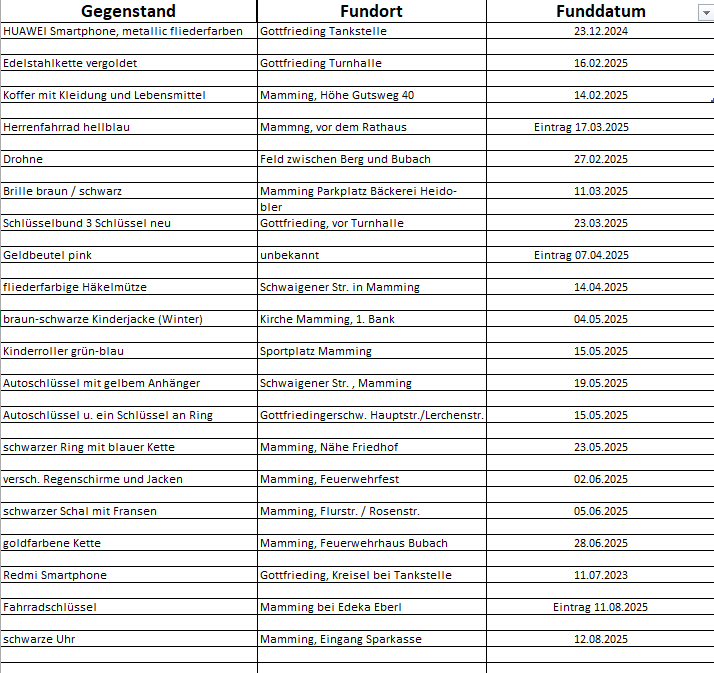 Hier haben wir die im Rathaus abgegebenen Fundsachen für Sie aufgelistet. Ist Ihr verlorener Gegenstand dabei? Dann setzen Sie sich bitte mit unserem Fundamt in Verbindung. Sollten Sie einen Gegenstand gefunden haben, geben Sie ihn bitte im Fundamt ab. Danke!