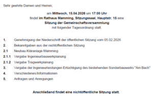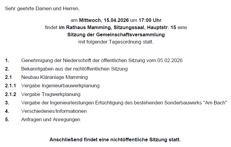 15. April 2026 - 17:00 UhrRathaus Mamming, Sitzungssaal